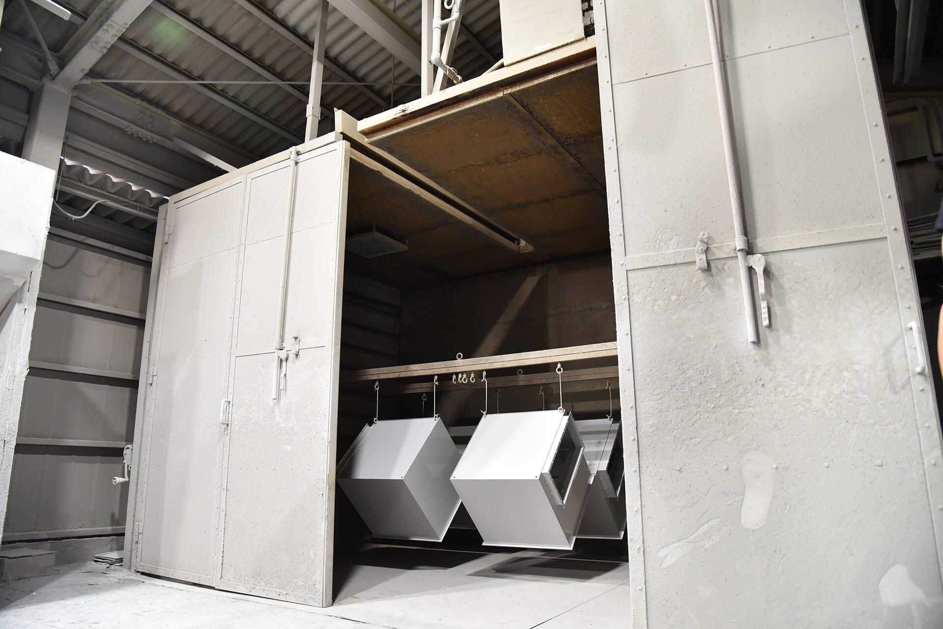 当社が得意とする大きなサイズの製品を、社外に持ち出すことなくそのまま自社内で塗装まで完了できることは、真のワンストップ生産を誇る当社の製造ラインの最大の自慢の一つです。塗装対応サイズの決め手となる焼き付け乾燥釜はW 3800 × H 2500 × D 3500mmの大容積を誇り、サイズの大きな筐体製品でも丸ごと納めることができます。また、塗料についてもアミノアルキド樹脂塗料や、アクリル樹脂塗料など、多種多様な塗料を取り揃え、お客様の製品の使用環境や用途に合わせ、最適な塗装方法をご提案いたします。